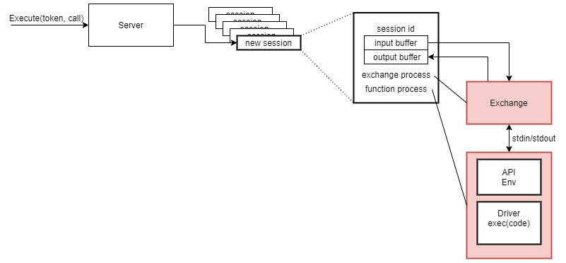Sessions are essential to allowing continuous and persistent data exchanges between a user and their function. They let a function be detached from a specific connection. A user can connect, disconnect, and reconnect multiple times and expect their function to continue running. Since the function doesn’t know when a client disconnects, the output data it generates will need to be buffered. Once a client has connected to the session this data buffer can stop accumulating data and start clearing to the client. A new Bento session is created each time a user sends an execute request. When a Bento server receives an execute request it retrieves the function corresponding to the request’s token and creates a new session. The server will then spawn an environment process which actually executes the function code. This process could be a sandbox or container and will define the environment the function executes in. Another process will be created to exchange data between the session’s input/output buffers and the environment’s standard in/out/err.
